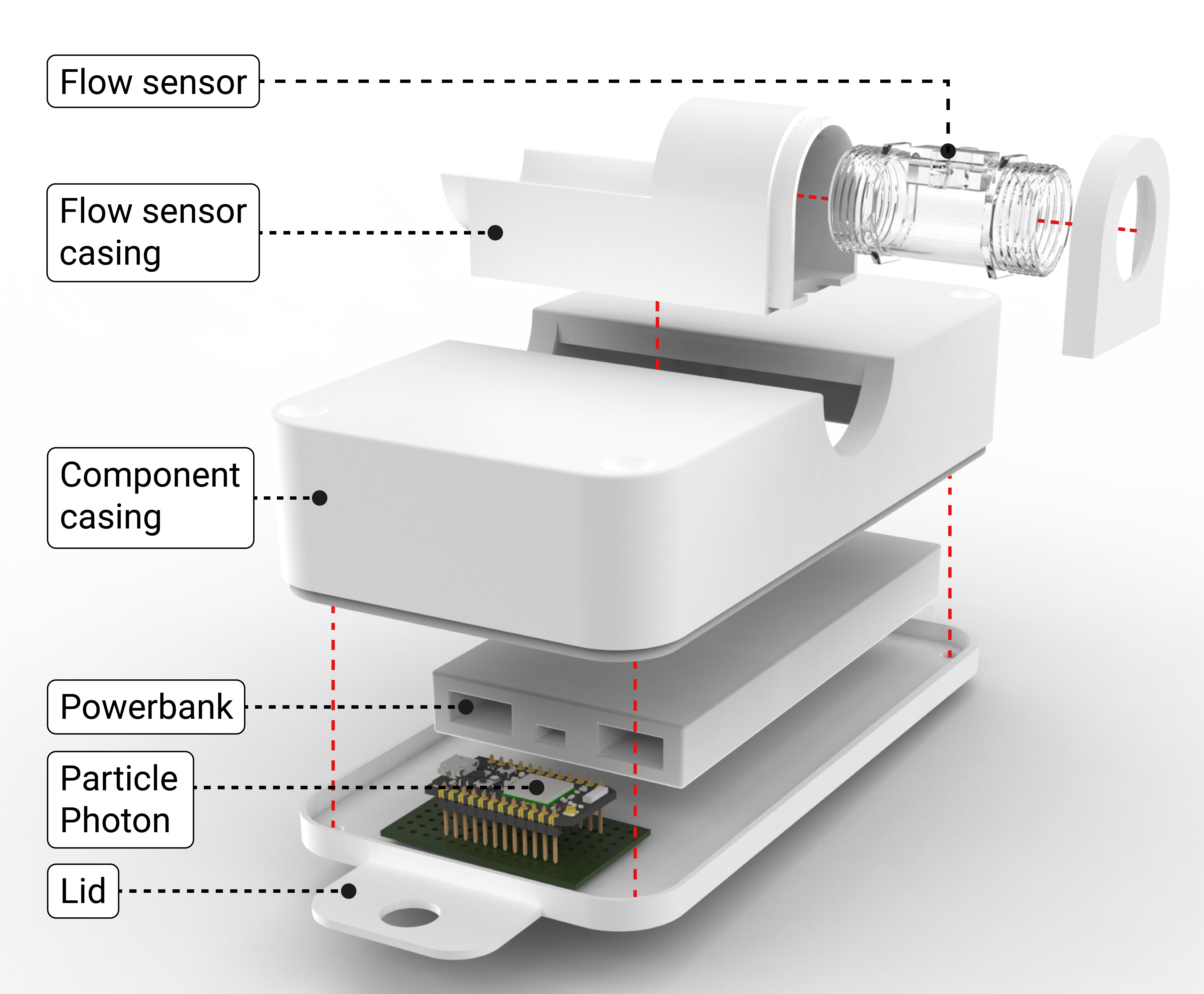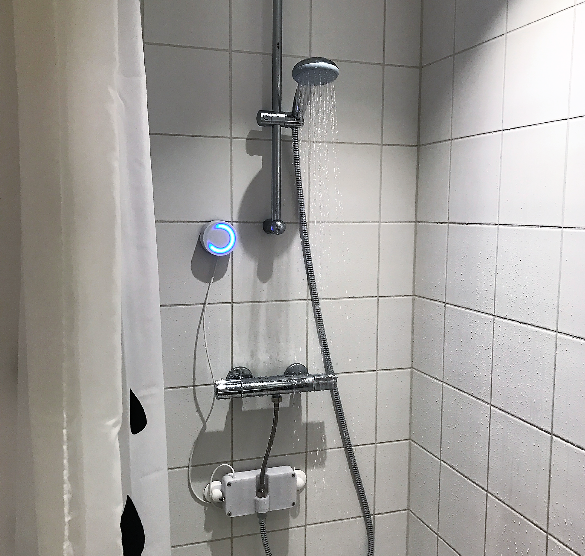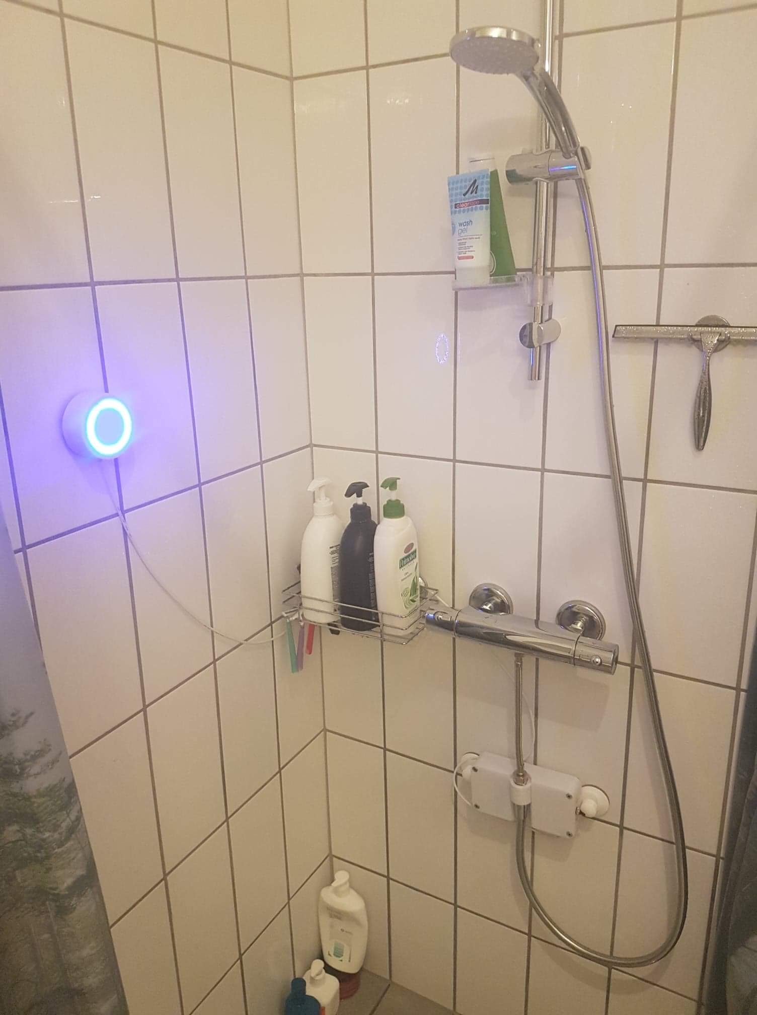 The in-shower device consisted of a sensor unit and a live-feedback display. The sensor unit measured the current shower water flow and sent this information to the live-feedback display. The display visualized this information in relation to a preset water consumption goal.